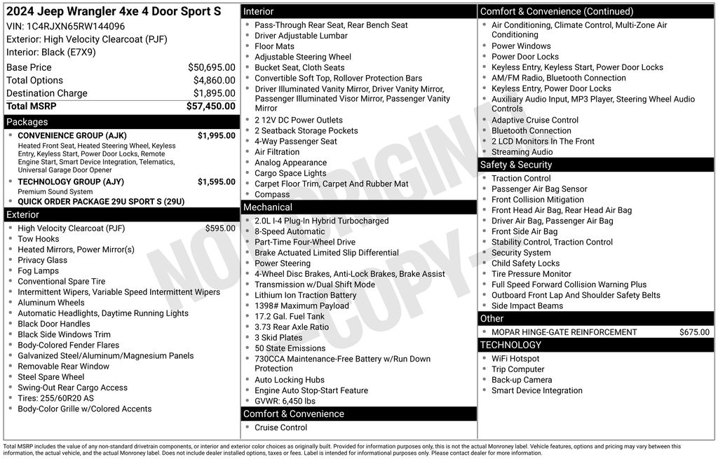 2.0L I4 DOHC, 2-Door Passive Entry, Front Door Locks, Alpine Premium Audio System, Convenience Group, Emergency/Assistance Call, EV/PHEV Vehicle To Load, Heated Front Seats, Heated Steering Wheel, Quick Order Package 29U Sport S, Remote Start System, Technology Group, Universal Garage Door Opener. This vehicle comes with the following features and options : Convenience Group (2-Door Passive Entry, Front Door Locks, Emergency/Assistance Call, Heated Front Seats, Heated Steering Wheel, Remote Start System, and Universal Garage Door Opener), Quick Order Package 29U Sport S, Technology Group (Alpine Premium Audio System and EV/PHEV Vehicle To Load), 2.0L I4 DOHC, 4-Wheel Disc Brakes, 8 Speakers, ABS brakes, Air Conditioning, Alloy wheels, Apple CarPlay/Android Auto, Automatic temperature control, Brake assist, Cloth Low-Back Bucket Seats, Compass, Delay-off headlights, Driver door bin, Driver vanity mirror, Dual front impact airbags, Dual front side impact airbags, Electronic Stability Control, Front anti-roll bar, Front Bucket Seats, Front Center Armrest w/Storage, Front dual zone A/C, Front fog lights, Front reading lights, Fully automatic headlights, Heated door mirrors, Illuminated entry, Integrated roll-over protection, Low tire pressure warning, MOPAR Hinge-Gate Reinforcement, Occupant sensing airbag, Outside temperature display, Overhead airbag, Panic alarm, ParkView Rear Back-Up Camera, Passenger door bin, Passenger vanity mirror, Power door mirrors, Power steering, Power windows, Radio data system, Radio: Uconnect 5 w/12.3" Display, Rear anti-roll bar, Rear reading lights, Remote keyless entry, Security system, Speed control, Split folding rear seat, Sport Suspension, Steering wheel mounted audio controls, Tachometer, Telescoping steering wheel, Tilt steering wheel, Traction control, Trip computer, Variably intermittent wipers, Voltmeter, and Wheels: 20" x 8" Machined/Painted Gray.